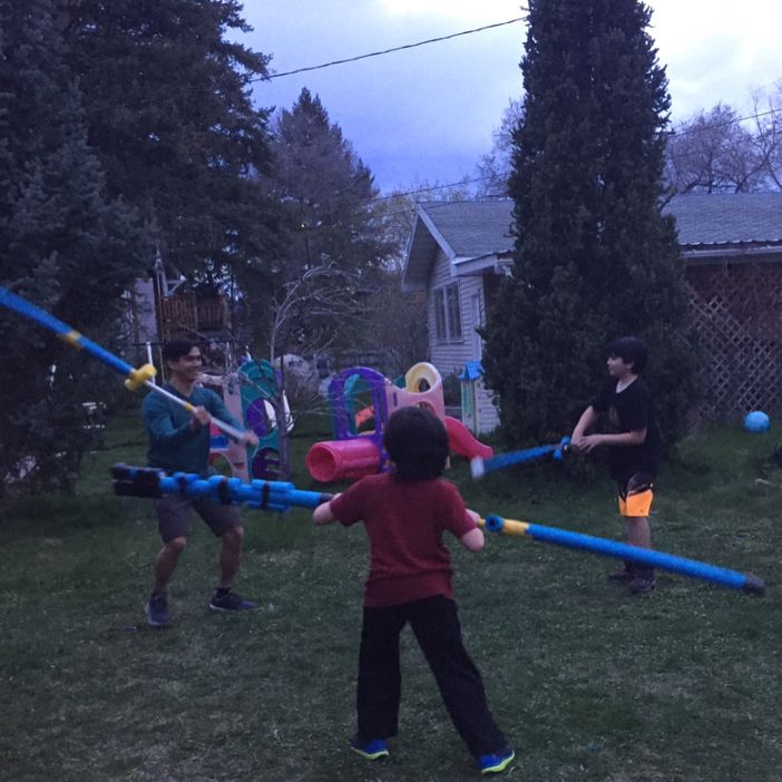 Homemade weapons forged from pvc pipes and pool noodles (slide for another action shot!) #creativekids #battlebuddy #diytoys