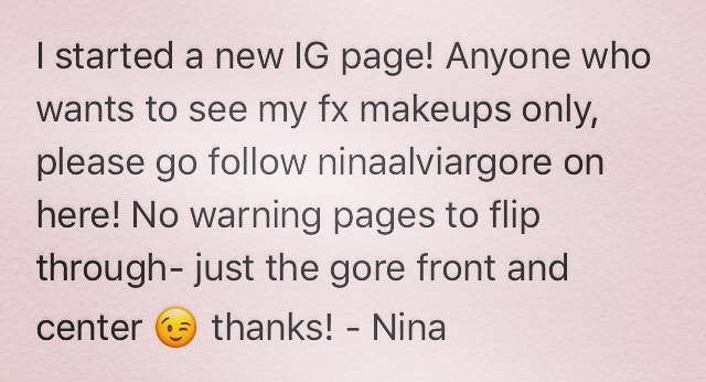 New IG page for me! Please follow ninaalviargore for my fx makeups with no "warning" pages to flip through 😉 Thanks!