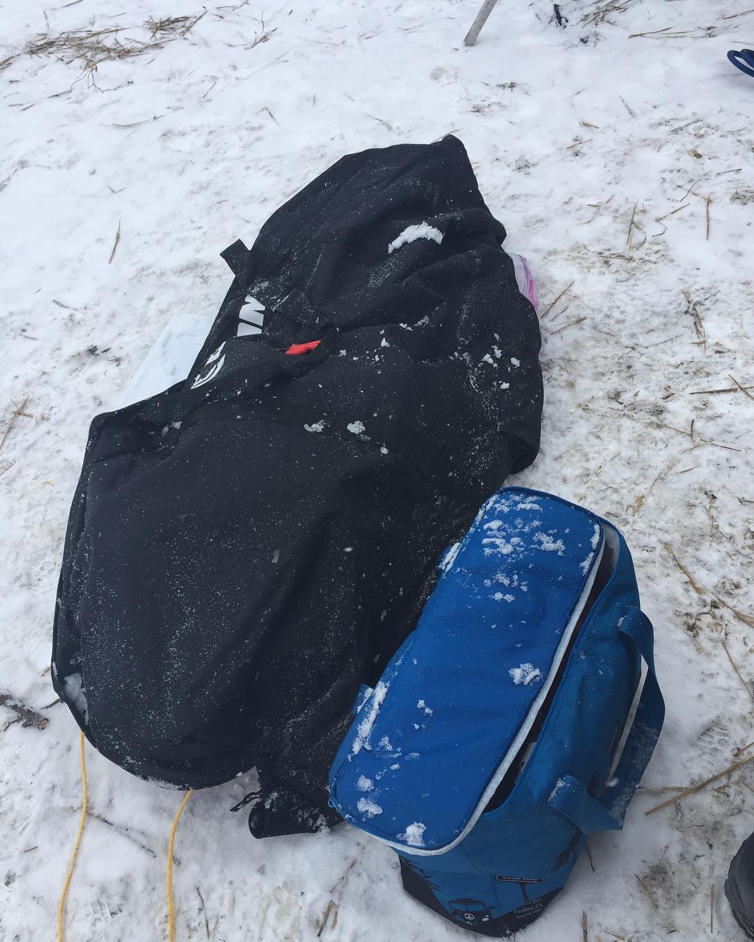 Sometimes this is the makeup department. Under that canvas cover with snow all over it is a sled with two set bags, one basics and one FX, a box of prosthetic wounds, a box of wrapping props for wounds, wipes, and other stuff. And in the blue warming bag is another set bag with a bunch of the same stuff. This is what location filming looks like, folks! We had so much fun today 😉