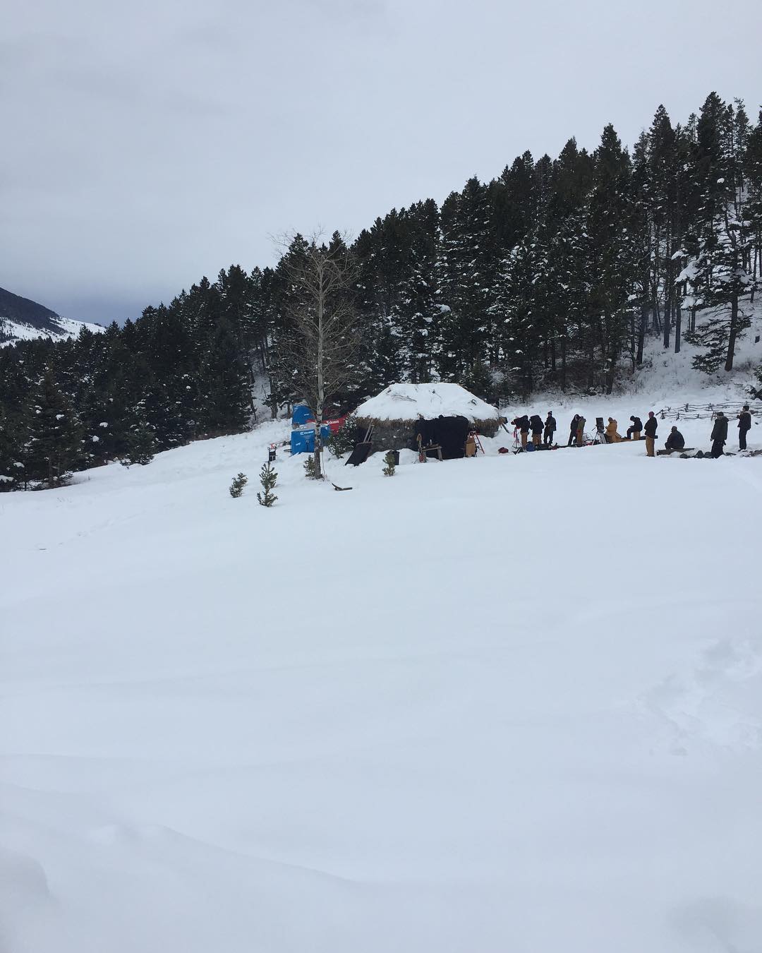Hardworking crew and actors in these snowy mountains, making a gorgeous movie. #onsetlife #makeupeffects #makeuponlocation #thebruce