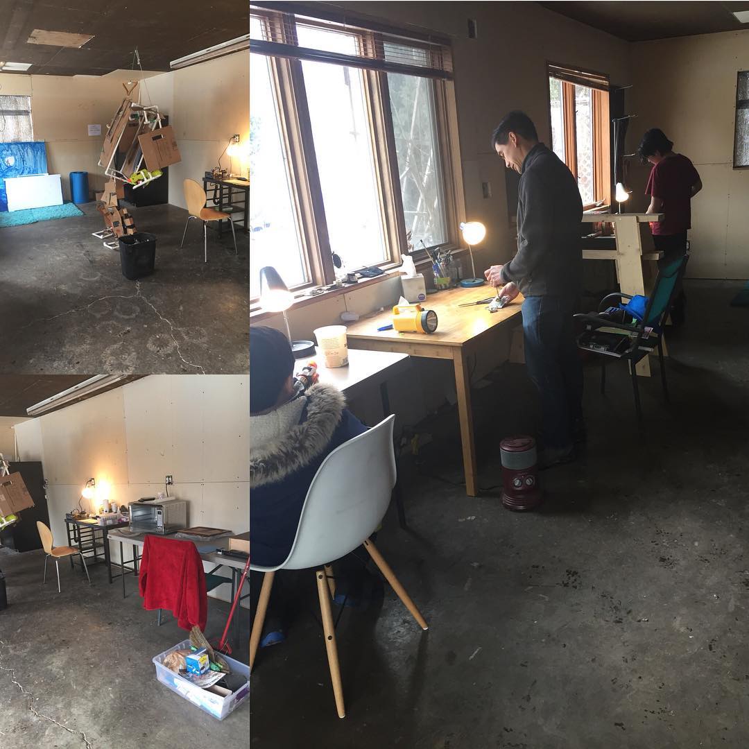 One work area turned into a four person maker space ❤️ We are making like crazy today. (That’s my kiddos wearable operational mech suit he built, btw :))