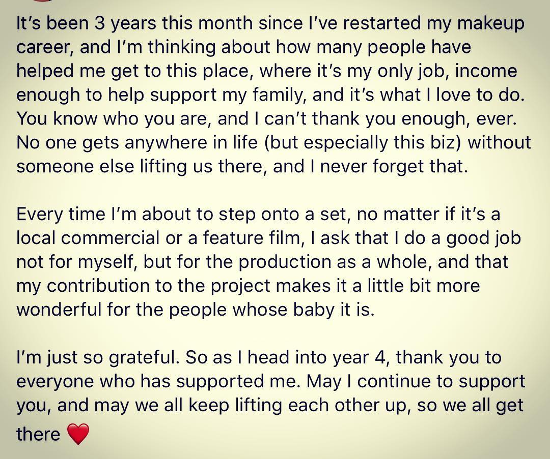 Year 14 (in total) begins with Much Gratitude 🙏 soaking it in today. #gratitude #noonesucceedsalone #makeupfx #makeupforfilm #camerareadymakeup #luckygirl
