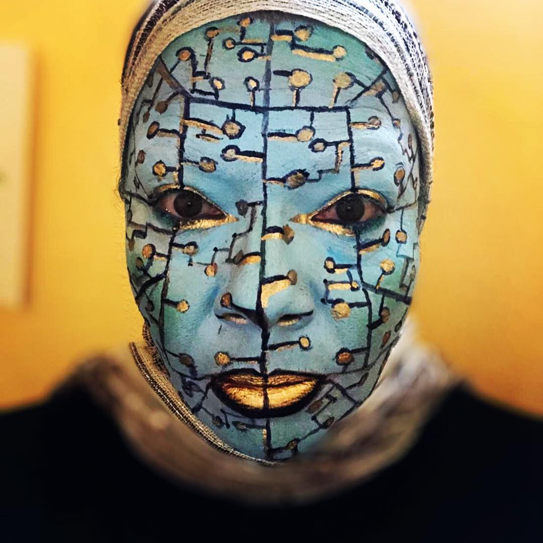 20 minute alien/cyborg who’s face is half off, exposing circuitry. Not the tidiest but still fun 😉 Happy Halloween!! #effectsmakeup #halloweenmakeup #cyborgmakeup #quickfacepaint
