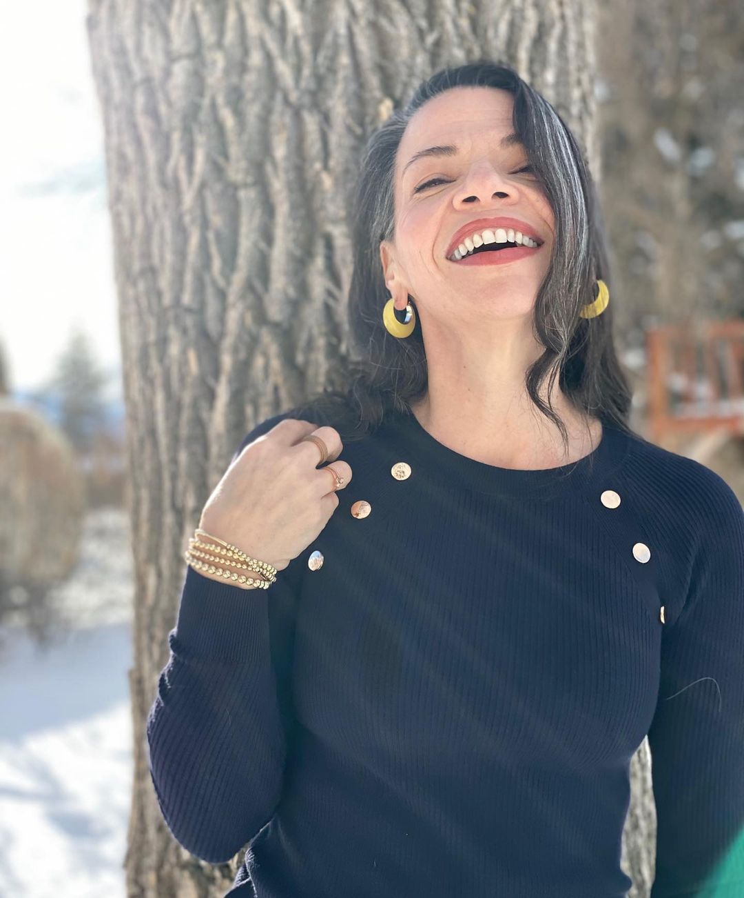Sweater, earrings, and bracelets by @loft here in snowy, blue skies Montana โ๏ธ๐