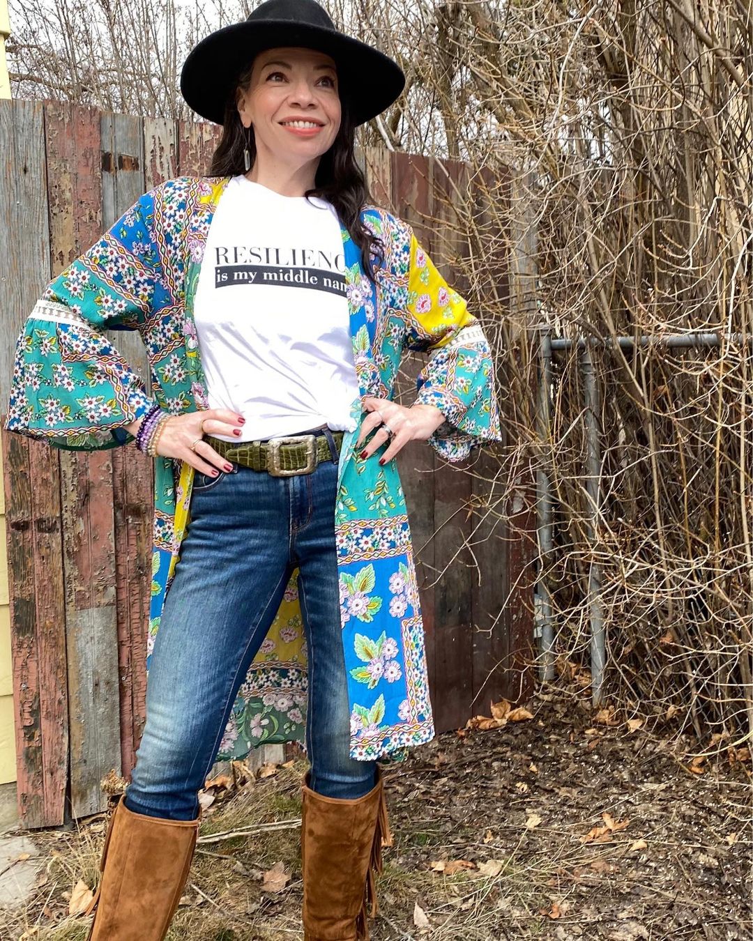 Resilience is indeed my middle name! Scroll through pics to see what I mean (the last pic shows my beautiful belly with the scar from my life-saving wonderful surgery that I am so grateful for, every day!) T-shirt by @_wisdomjunkie_ Duster, earrings and bracelets by @savannahhoffmandesigns Belt by @saks Hat and boots I’ve had for ages and can’t remember 😆 #colectomysavedmylife #noexcuses🚫 #resilienceismymiddlename #bohochicstyle #liveeverymoment 📸 @donteschnerofficial