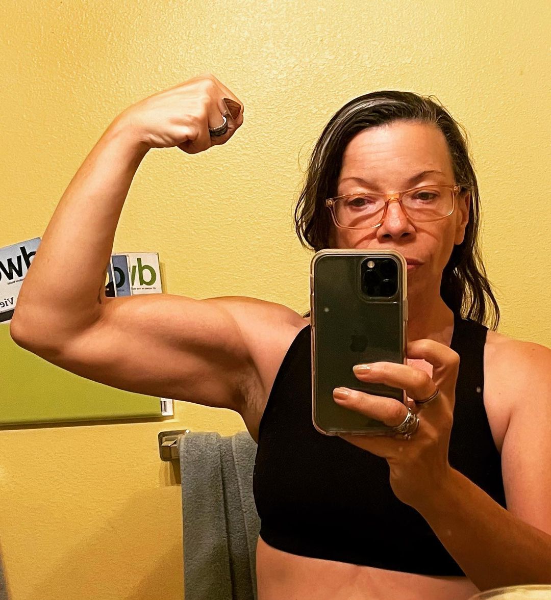 Four weeks of lifting heavier and upping my protein. Drowned rat sweaty pre-shower look is extra 😂 #fitat50 #ageisjustanumber #momomuscle #jnlgymvip #womenwholiftheavy