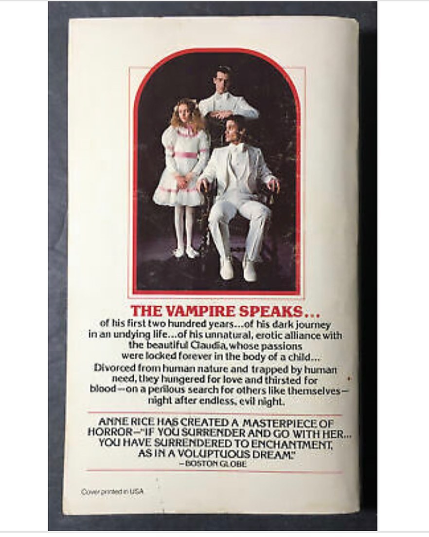 My sister gave me Interview when I was about 15, a tattered 1977 paperback that I still have somewhere, the back is below- a portrait of Lestat, Louis, and Claudia. My goth heart was truly born then.