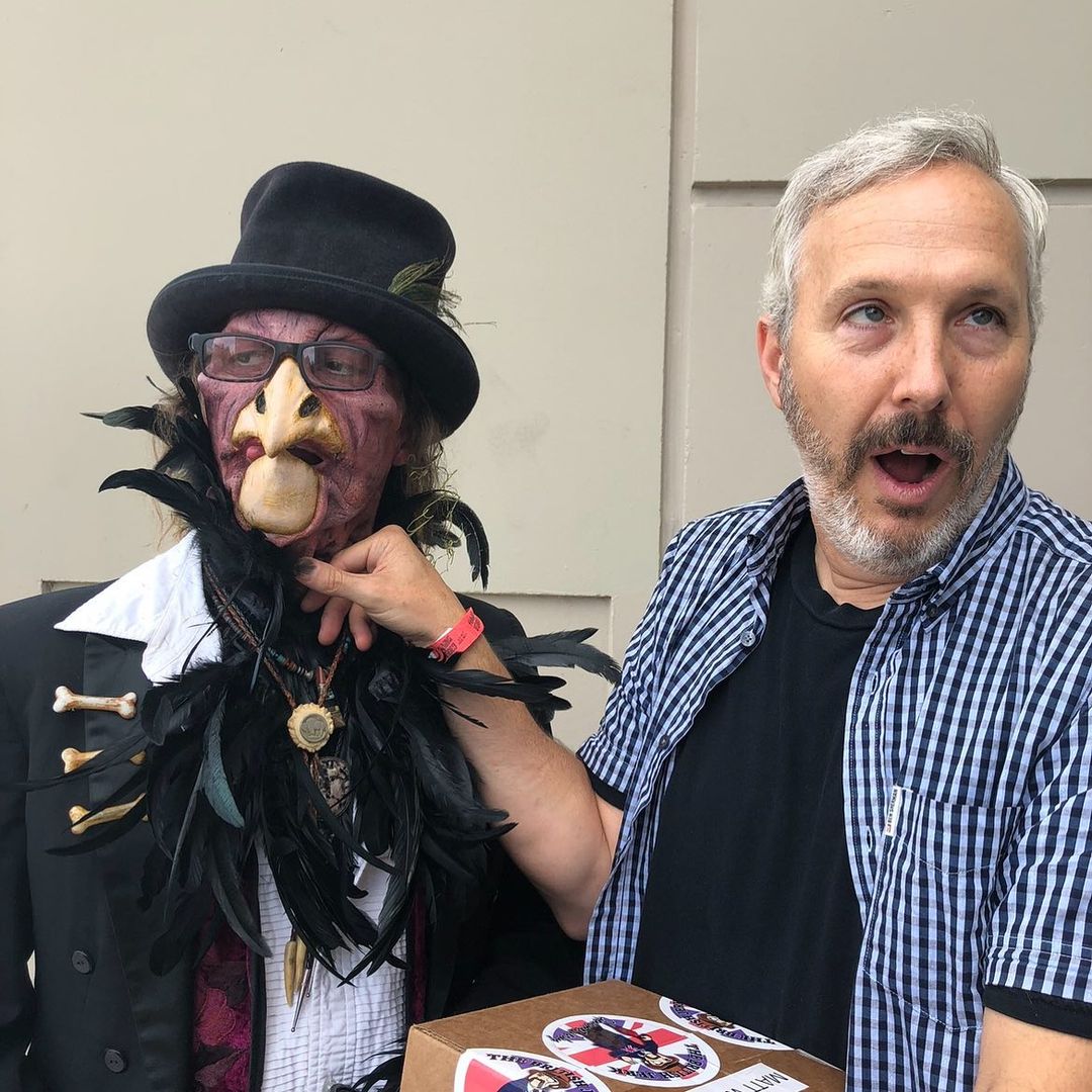 That time @_mattwinston_ got reeeaaallly into the wattle on my Jive the Witch Doctor Turkey Vulture (@donteschnerofficial) character, at Son of Monsterpalooza a couple years ago 😂 (assisted by Miranda Riddle)