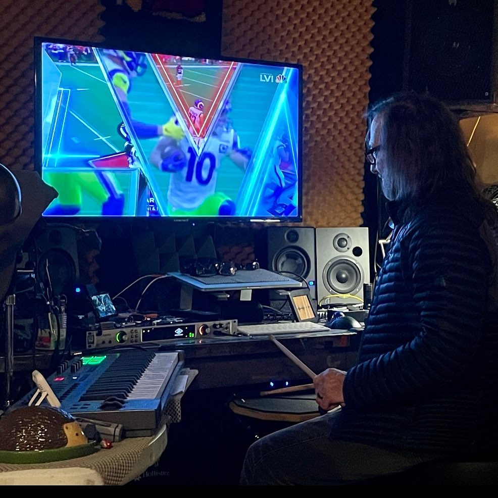 Drumming and footballing. As you do. And patiently explaining the football thing to this hockey/basketball chick. 🏈🥁 #superbowl2022
