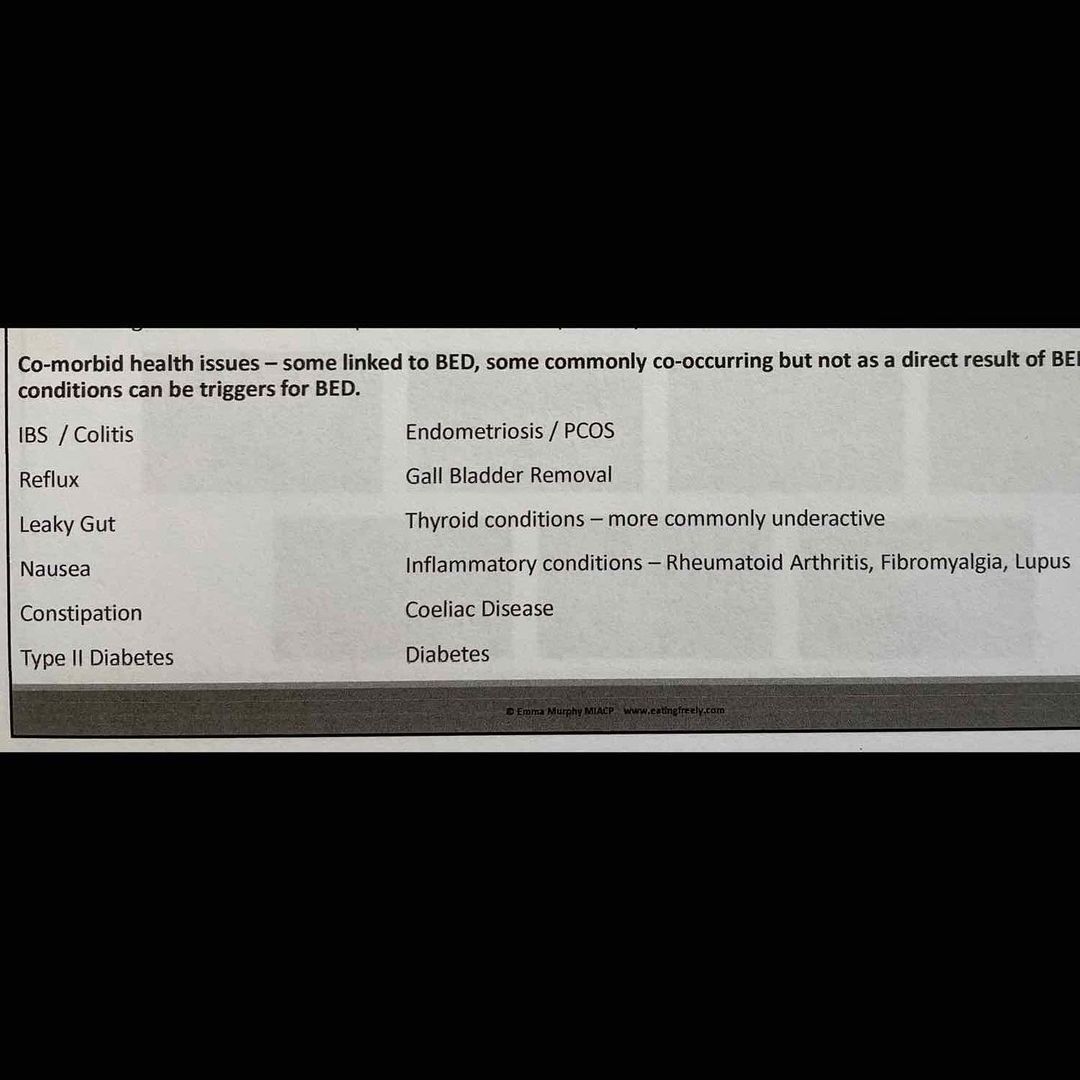 Image reads: Comorbid health issues, some linked to BED, some commonly co-occurring but not as a direct result of BED, some health conditions can be triggers for BED.