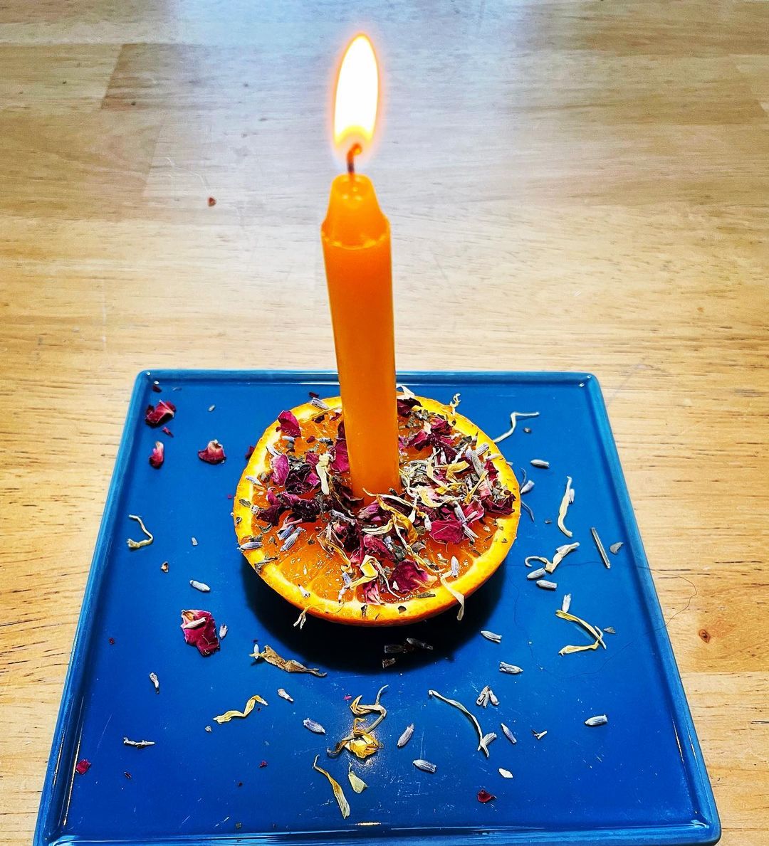 Envisioning laughter, feeling thrilling love, hearing kind words, smelling the fresh renewing Spring air through the window, and tasting the other half of the orange, as this candle burns down, all our senses are refreshed. As I speak it, so it is.