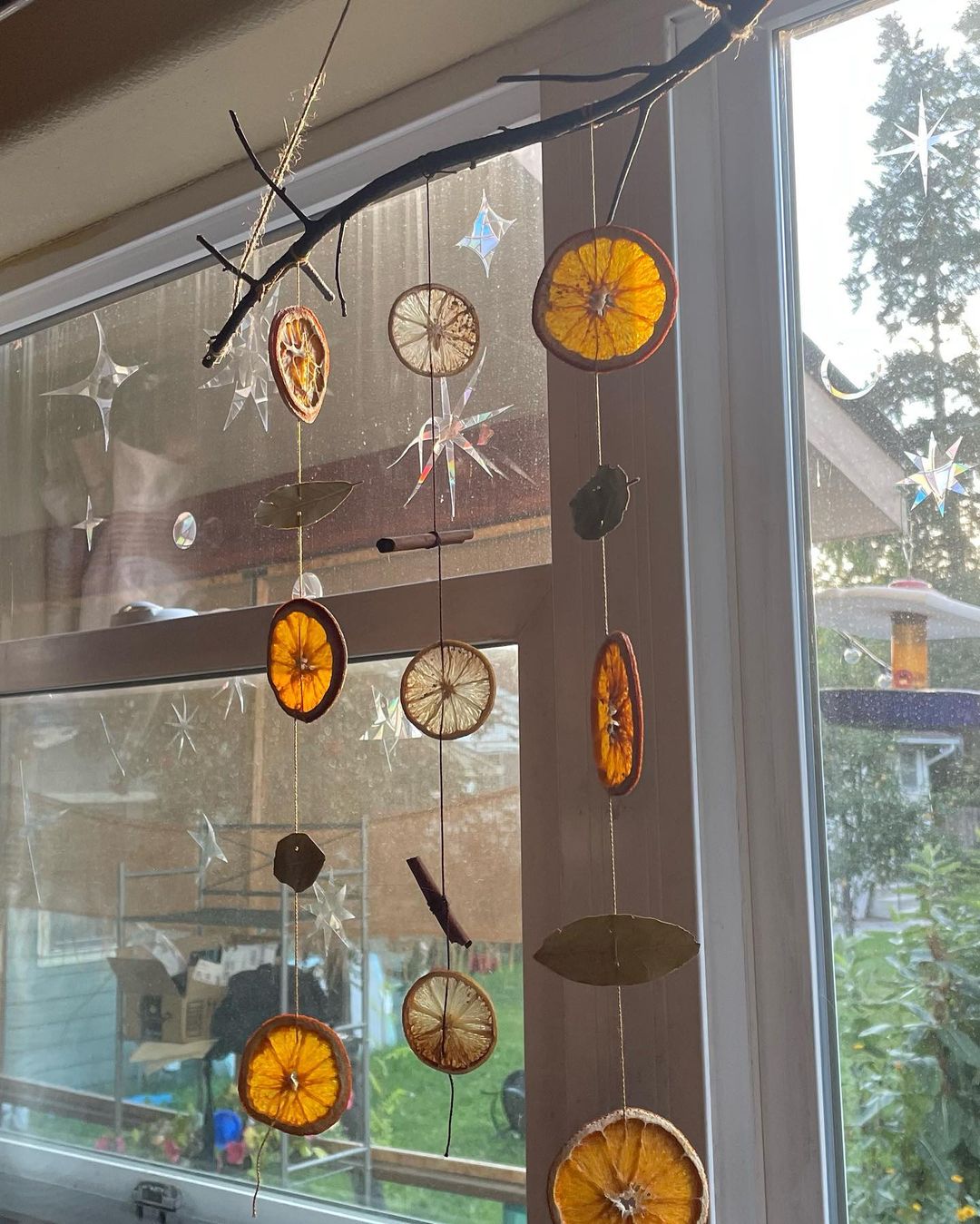 I made a thingy! Dried orange and lemon for joy and love, bay leaves for protection, abundance and wellness, and cinnamon for prosperity ❤️ the sun coming through it is so lovely.