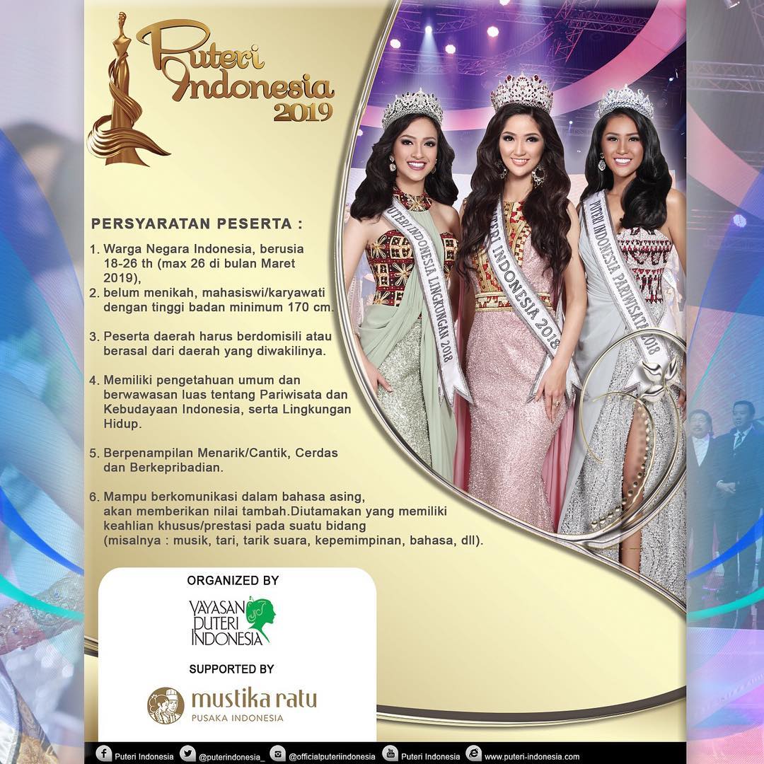 Cantik, menarik, cerdas, berkarakter dan menginspirasi adalah gambaran setiap wanita di Indonesia. THIS IS YOUR MOMENT TO SHINE 🌟✨ Persiapkan dirimu dari sekarang. Saatnya menggapai impian menjadi kebanggaan Indonesia dan daftarkan dirimu untuk mengikuti PEMILIHAN PUTERI INDONESIA 2019 ♥️🇮🇩 Are you ready?