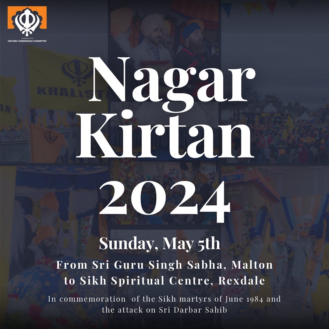 The Sri Akhand Paath bhog will happen on Sunday morning and a Diwan will follow along after. The Nagar Kirtan will depart from Malton Gurdwara at 11:30pm. The Nagar Kirtan will arrive at Rexdale Gurdwara Sahib at approximately 6:30. There will be a Diwan at Rexdale Gurdwara Sahib all day. We request the sangat to come to the Nagar Kirtan to commemorate the Khalsa Panth and 40th anniversary of the attack on Sri Darbar Sahib during 1984.