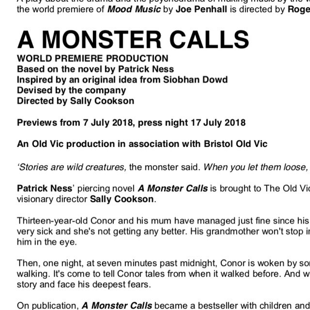 ANNOUNCEMENT! I am beyond excited to announce that a stage production of A Monster Calls is coming to the West End! As part of its 200th anniversary season, the Old Vic has a new production directed by the very brilliant Sally Cookson. It’ll preview for three weeks at the Bristol Old Vic before coming to London in July. I’ve seen the workshops; Sally is amazing. Wait til you see what she’s doing...