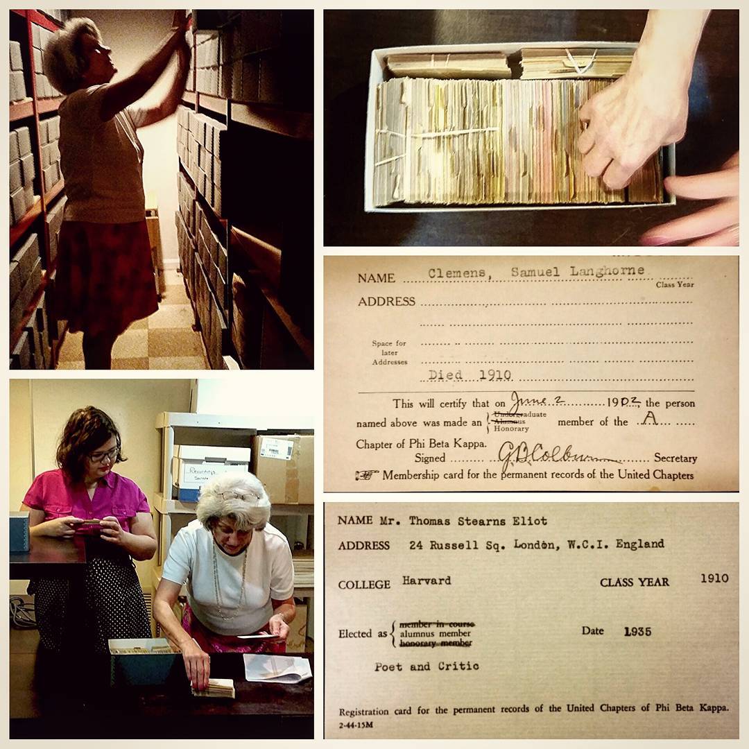 For #WayBackWednesday, we went to the archives to find the original #PhiBetaKappa membership cards of T.S. Eliot (ΦBK, Harvard University, 1935), and Mark Twain, née Samuel Clemens (ΦBK, University of Missouri, 1902). Pictured are Phi Beta Kappa Society Associate Secretary Ronnie Roha (ΦBK, Allegheny College, 1970) and #PBK Summer Intern Katie Hurlock (ΦBK, Mary Baldwin College, 2015).