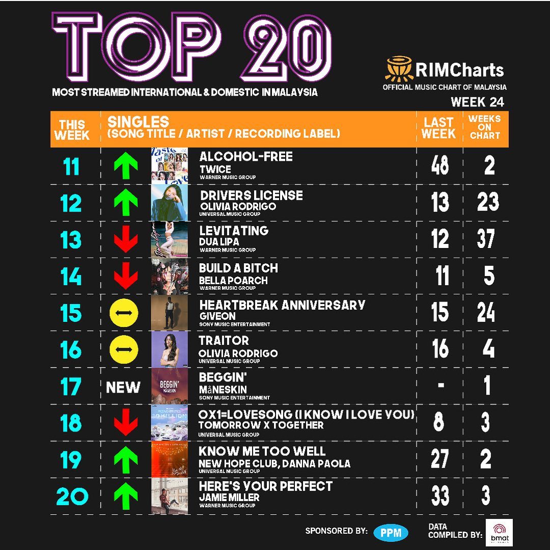 Top 20 Most Streamed International +Domestic Songs Week 24 (11/06/2021-17/06/2021) #recordingmusicmalaysia #topstreaming