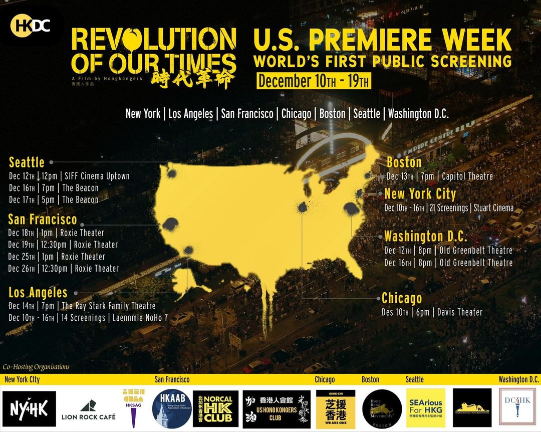 There will be screenings of Revolution of Our Times in 7 U.S. cities, including Boston, Chicago, Los Angeles, New York, San Francisco, Seattle, and Washington D.C., for its U.S. Premiere Week from December 10th to 19th. The campaign has so far received overwhelming enthusiasm and support.