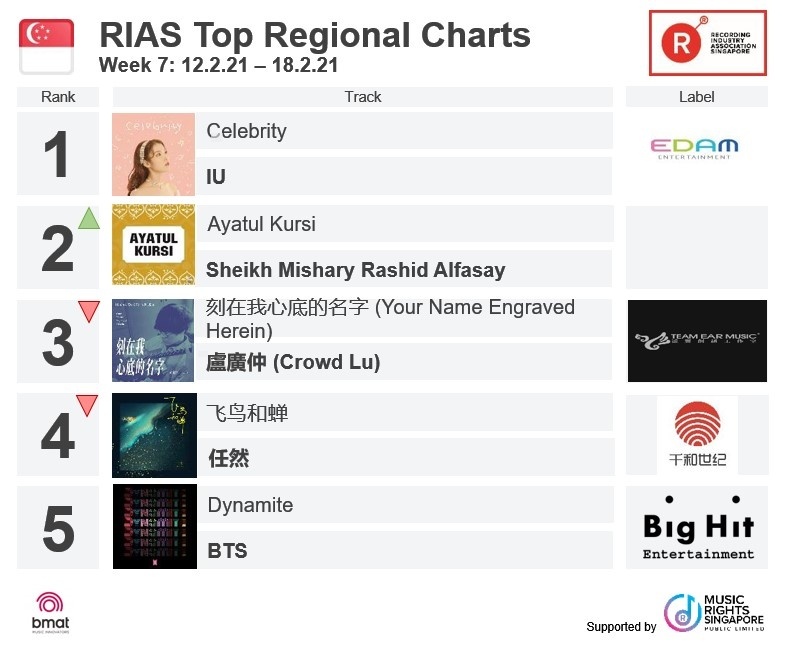 Check out RIAS Top Digital Streaming & Top Regional Charts (Week 7) Full charts ➡ www.rias.org.sg/rias-top-charts/ #IUCelebrity #盧廣仲 #刻在我心底的名字 #飞鸟和蝉 #任然 #btsdynamite #driverslicense #OliviaRodrigo #AtMyWorst #PinkSweats #LoveStory #TaylorSwift #SaveYourTears #TheWeeknd #riassg #riascharts #musicchart #Bmat #topstreaming #sgmusicchart #BTS