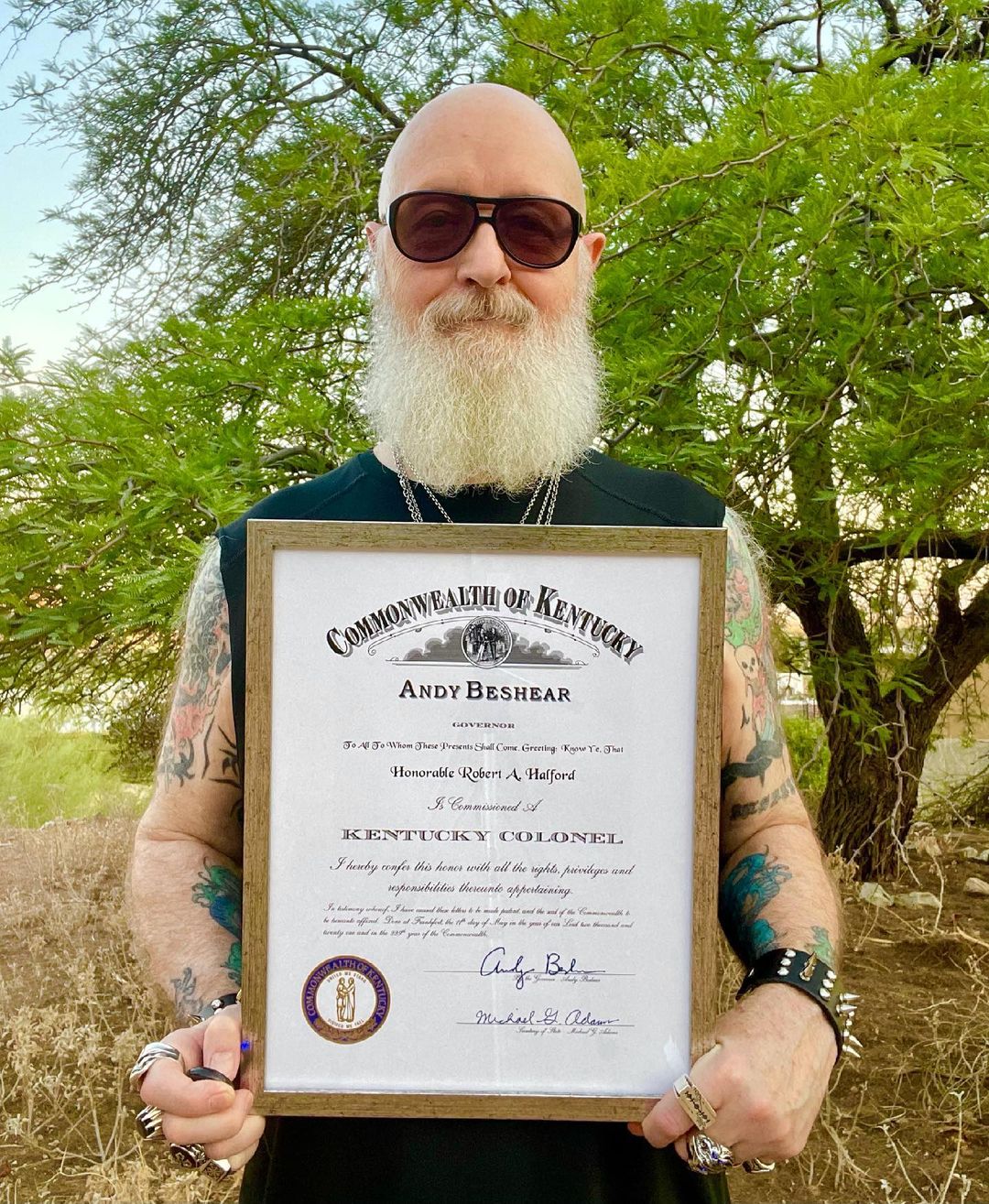 “thank you governor and the people’s of Kentucky a great honour and organisation that’s making good things happen” 🤘🏻😈🎤🔊💛#heavymetal #ink #tattoo #motivation #honor #good #vibes #group #kentucky #charity #community #awareness #style #love #family #friends #fans #one #world #peace #respect #all @kycolonels