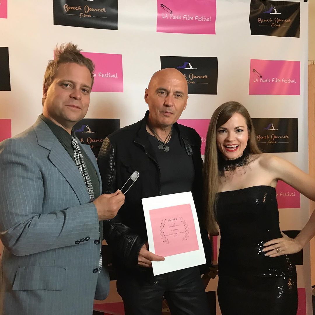 Last night our film “Scumbag” won Best Comedy Film for 2018 at Los Angeles Punk Film Festival! That now makes 7 wins, 5 nominations and 16 film festivals! Way to go team! One giant leap for Scumbags everywhere. Watch our film from the link in our bio @scumbagthemovie From left, director Mars Roberge, producer Tamas Birinyi and lead actress Debra Haden. @marsroberge @feminineoddities @tamas.birinyi @beachdancerfilm #bestcomedyfilm