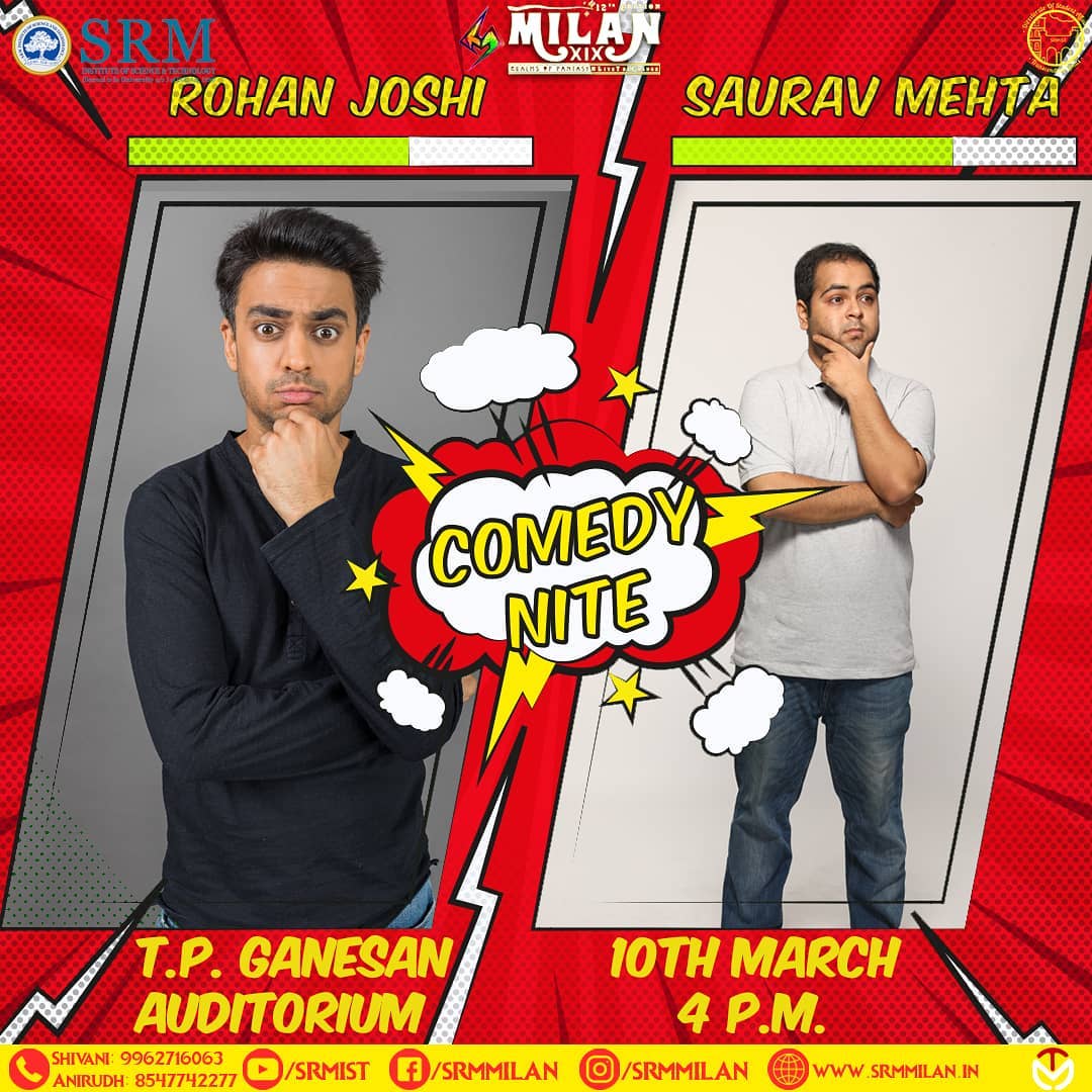 They say the most wasted of all days is one without laughter and on the last day of Milan’19 we want to make sure you have made the most of it. Milan’19 presents Comedy Night with Rohan Joshi and Saurav Mehta on 10th of March 2019 at T.P Ganesan Auditorium. Are you ready to laugh as much as you breathe? @mojorojo @sauravmehta90 #SRMIST #Milan19 #milanforacause #comedynite #rohanjoshi #sauravmehta