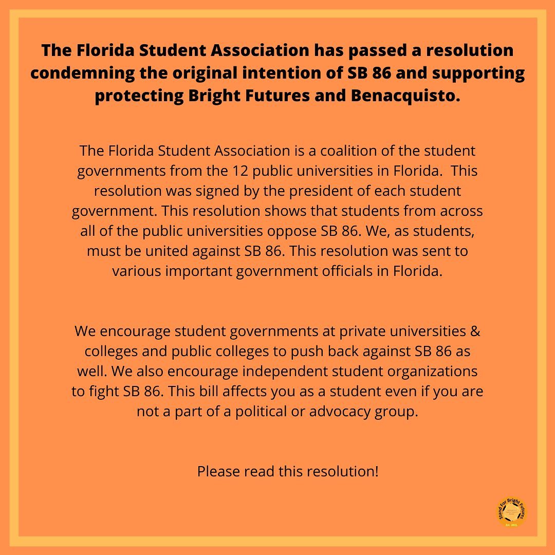 We are proud to share this resolution by the @floridastudentassociation against the attack on Bright Futures by SB 86. This is your student governments at work! Please spread the word so that the politicians know we are united in opposition. If these rival schools can put aside their competitive spirit for this, we can do anything! #sb86 #stopsb86 #notosb86 #flapol #ufl #fsu #famu #flpoly #usf #ucf #unf #fiu #fau #ncf #uwf #fgcu