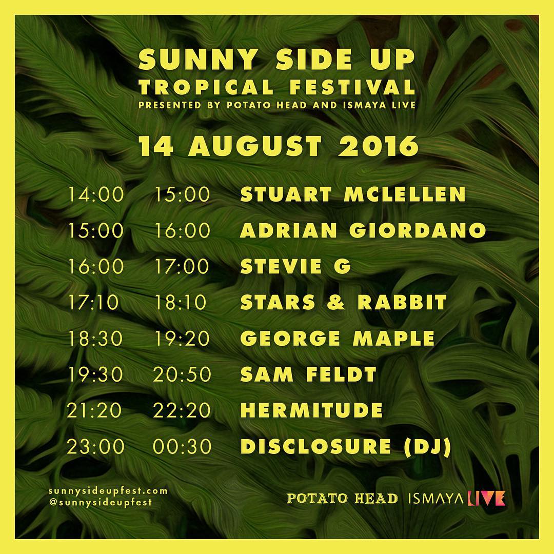 Set times for Sunday are here! We have a VERY limited number of tickets left for @disclosure today. If you plan to attend, we recommend hurrying down to @potatoheadbali now to secure yours. #sunnysideupfest #bali