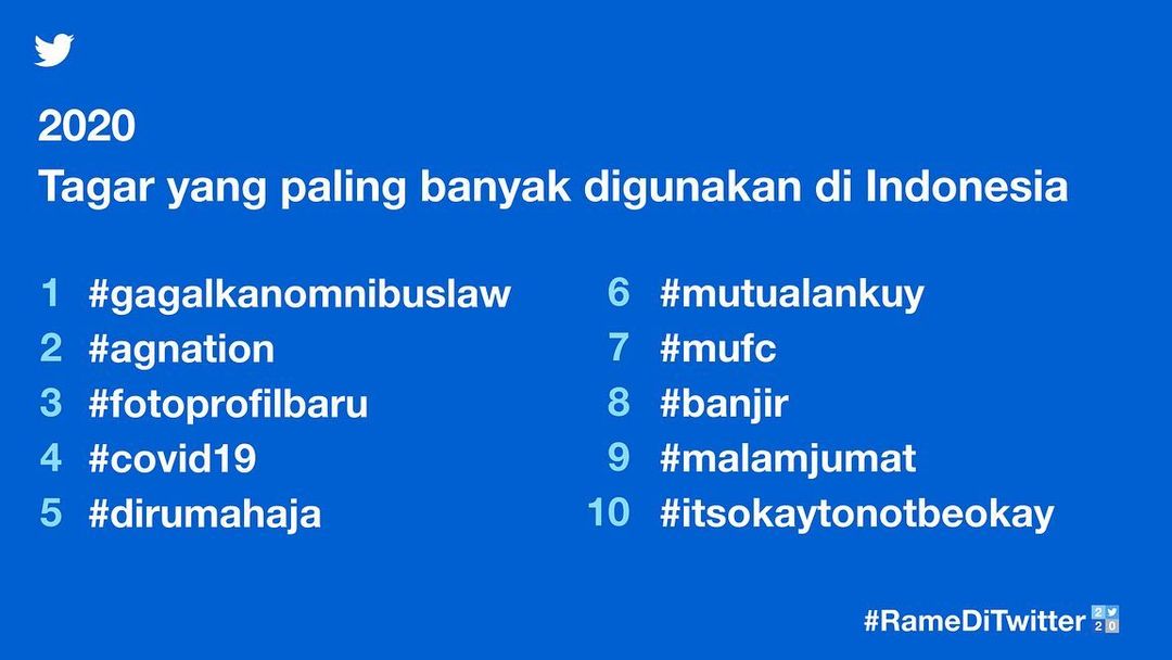 Twitter Indonesia Recap #RameDiTwitter 2020. 1. @AGNEZMO, #2 most discussed entertainment account in Indonesia 2. #AGNATION, #1 most used entertainment hashtag in Indonesia 3. #AGNATION, #2 most used hashtag in Indonesia