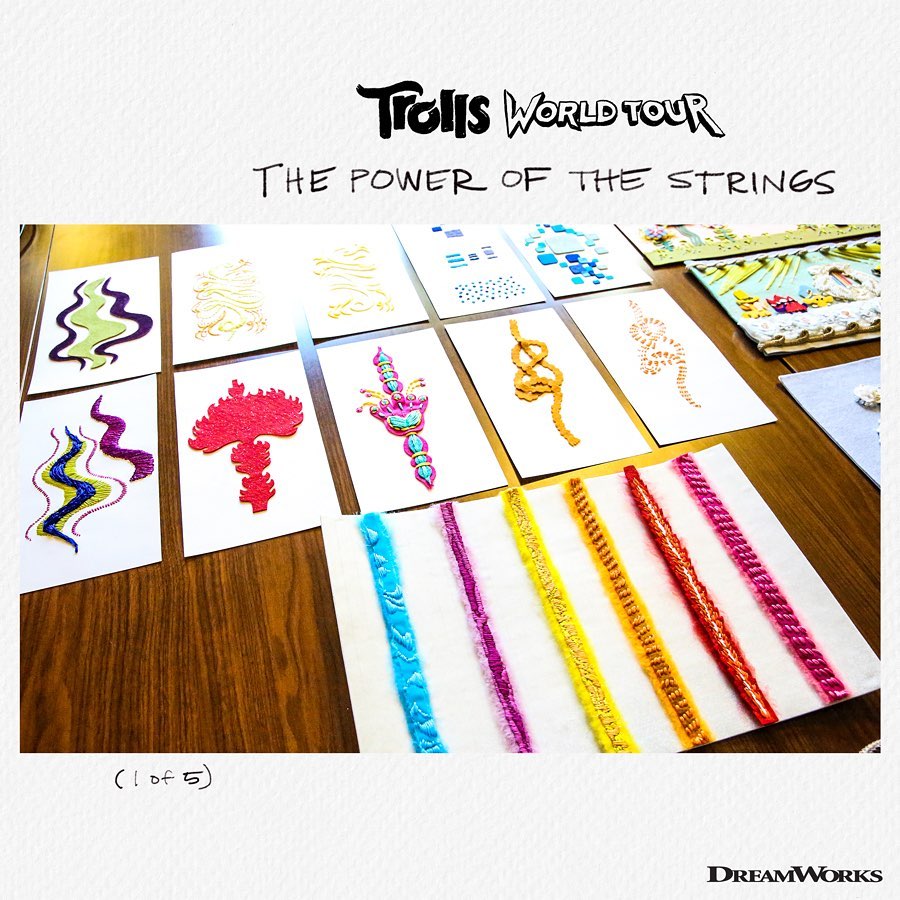 An Annie nominee for “Trolls,” Texture and Visual Development Artist, Priscilla Wong, takes inspiration from the musical genres to create six musical strings (second and third image). These art pieces are tactile, textured creations that become animated in the film. #TrollsArtTuesday #TrollsWorldTour