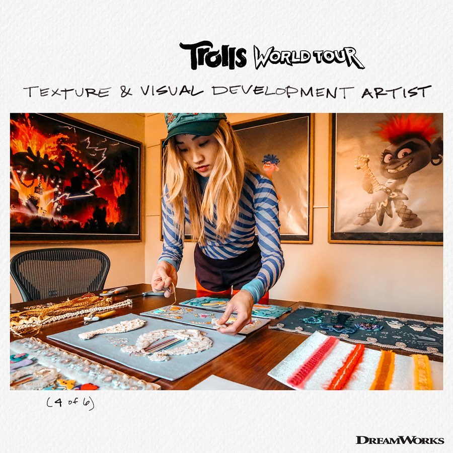 Texture and Visual Development artist Priscilla Wong (fourth image) creates each element of the scroll seen in the film out of felt, yarn and other fabrics that inspire her. Once the physical artwork is complete it is scanned into the computer and brought to life on screen. #TrollsArtTuesday #TrollsWorldTour