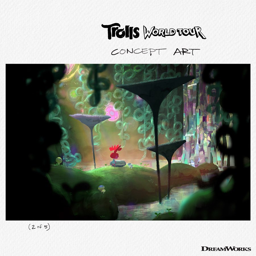 Visual Development Artists, Alexandre Puvilland and Frederic Stewart, explore the world outside of Pop Village through concept art. Lead Colorist, Gregory K. Creaser (on left in third image) and Colorist, Paul McGhee (on right in third image) finalize a scene in Pop Village. This is moments before Pop Village is joined by its newest member, Tiny Diamond (@kenanthompson). #TrollsArtTuesday #TrollsWorldTour
