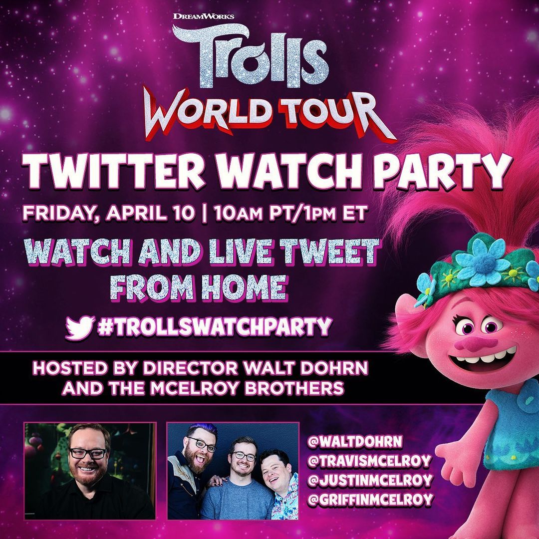 Join director Walt Dohrn (@dohrnwalt) and the McElroy Brothers (@travismcelroy, @justinmcelroy and @griffinmcelroy) for #TrollsWorldTour live-tweet Friday at 10AM PT/1PM ET! Tweet along using #TrollsWatchParty & pre-order the movie here: watchtrolls.com