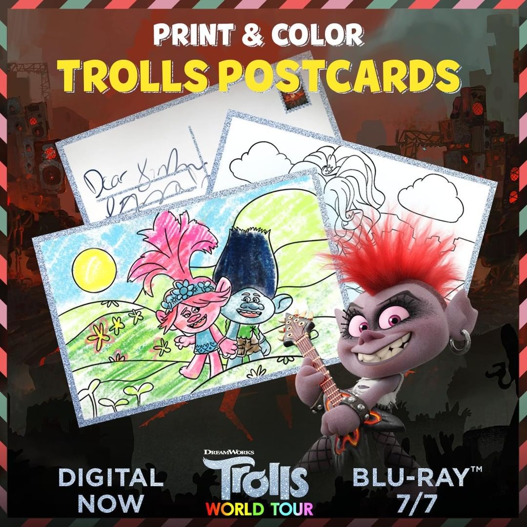 Want to send your friends some ❤️? Print & color Trolls postcards at create.dreamworks.com! #TrollsDanceParty is yours to own on Digital now, Blu-ray 7/7.