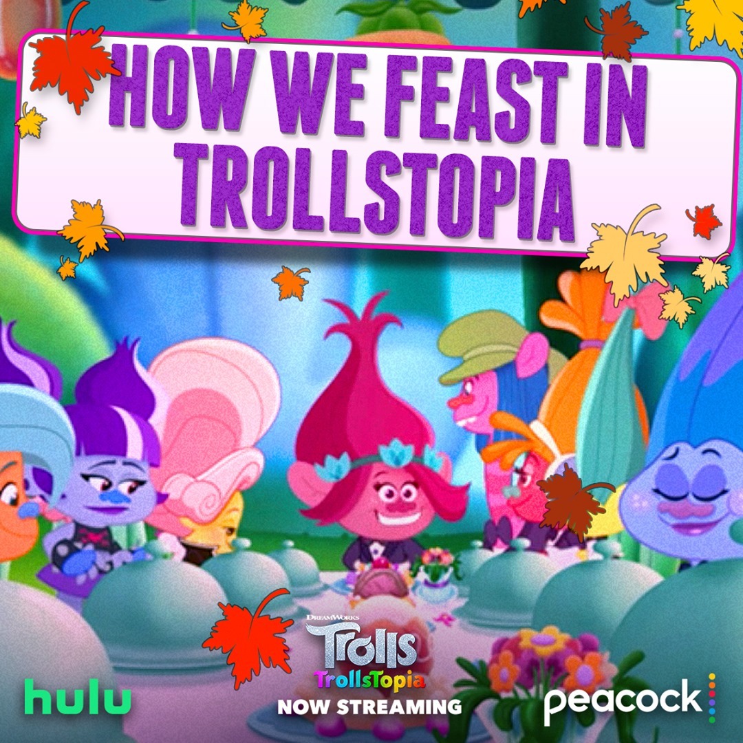 Tag a friend you'd invite to a #TrollsTopia feast! New series now streaming on @Hulu and @PeacockTV!