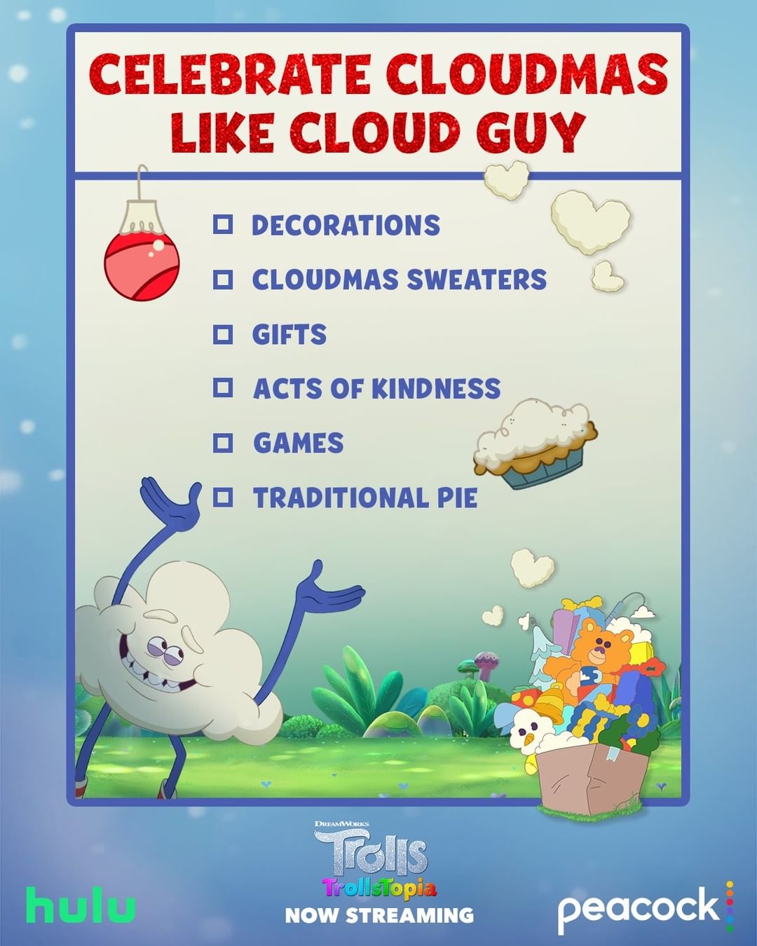 The fluffier the merrier! Celebrate Cloudmas like Cloud Guy this holiday season. #TrollsTopia is NOW STREAMING. #DreamWorksTrolls