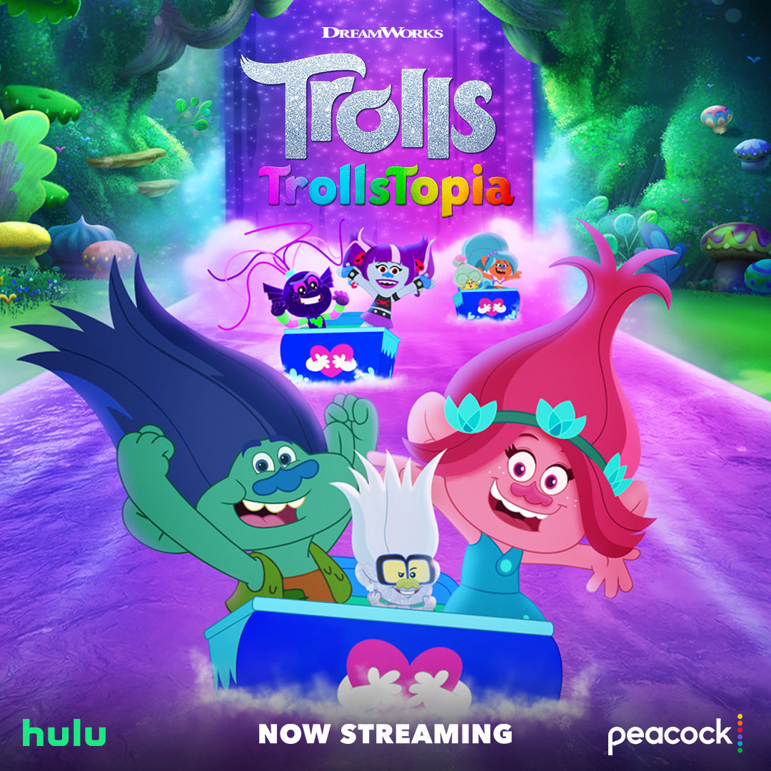 Time for a wild ride! New episodes of #TrollsTopia are NOW STREAMING on @hulu and @peacockTV.