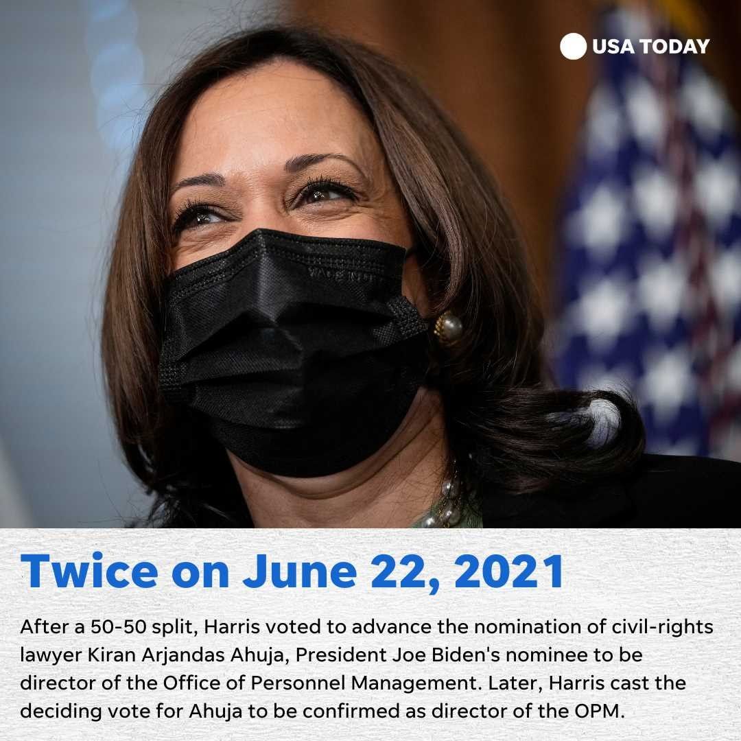 With a split Senate, Vice President Kamala Harris serves as the tie-breaking vote in the Senate. Swipe ➡ through to see all the times Harris has had to break a Senate tie since she took office in January. Her first two took place on February 5 for an amendment proposal for a budget resolution and she then voted on the final passage of the budget resolution that allowed Democrats to fast-track President Biden's COVID relief package. Then, a month later, Harris broke a 50-50 tie to send Biden's COVID-19 stimulus bill to debate, which included the $1,400 stimulus checks. The following three times were to advance Biden's nominatations for a Pentagon undersecretary and the director of the Office of Personnel Management.