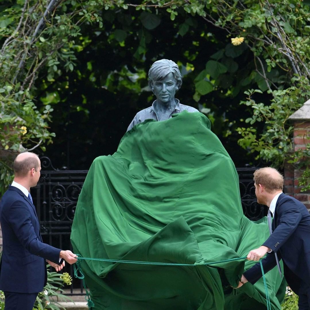William, 39, and Harry, 36, greeted guests separately, but together, they revealed the 1-and-a-quarter life-size bronze statue of Diana from under a green tarp and stood an arms' length away while admiring the work. "Amazing," Prince William could be heard remarking at one point.