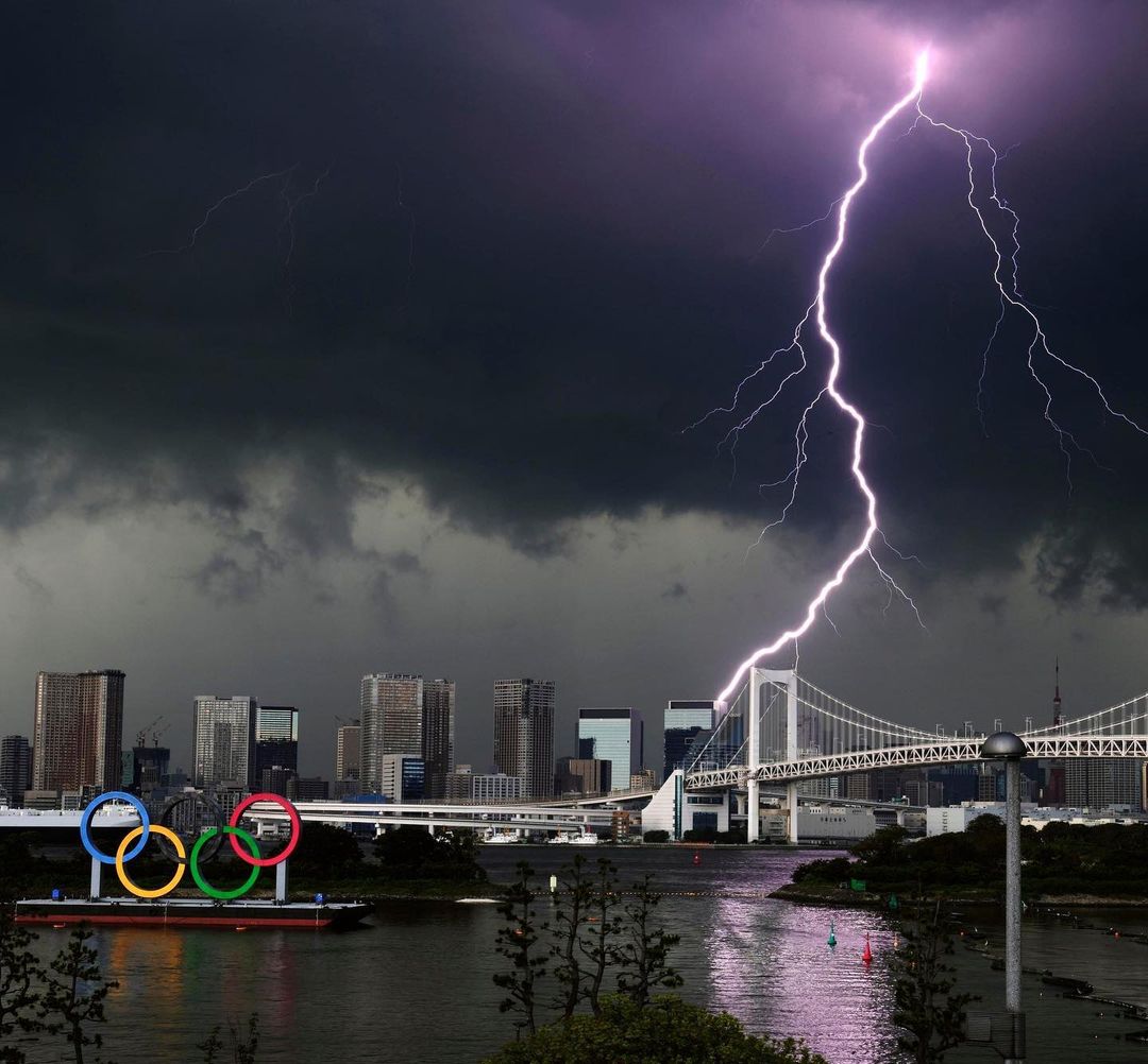 A lightning bolt illuminated the sky on Sunday over the Olympic rings and the Rainbow Bridge in Tokyo, the home of this year's Games.