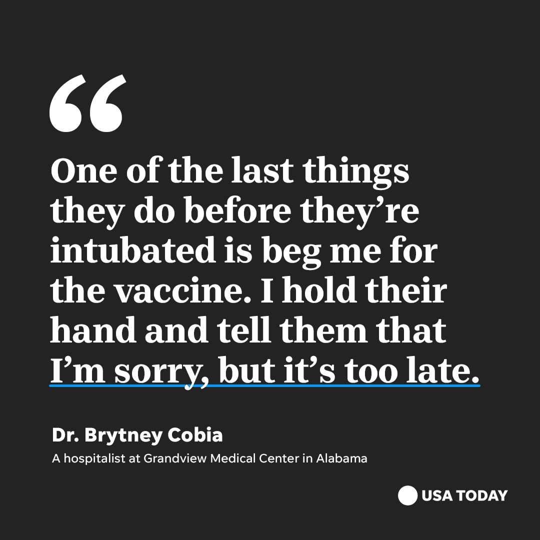 Cobia says that, when the patient dies, she hugs their family members and urges them to get vaccinated. She says they cry and tell her they thought the pandemic was a hoax, or political, or targeting some other age group or skin color.