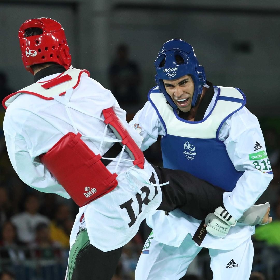 In the first photo, Taufatofua is joined by Malia Paseka to bear the Tongan flag during the opening ceremony for the Tokyo 2020 Olympic Summer Games. The second shows Sajjad Mardani of Iran competing against Taufatofua in the men's +80kg round of 16 taekwondo match during the Rio 2016 Summer Olympic Games.