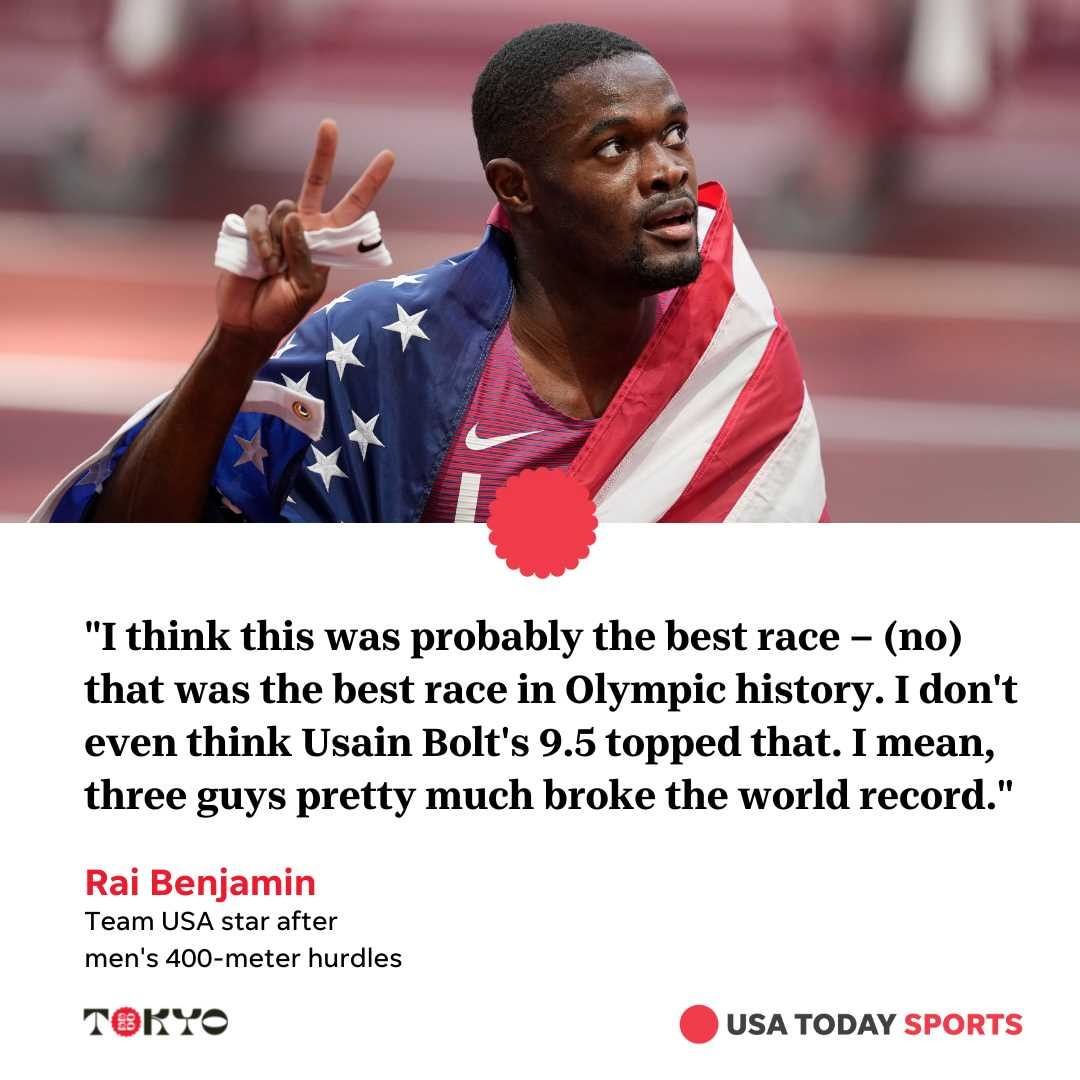 In one of the most highly-anticipated matchups on the track in Tokyo, Norway's Karsten Warholm narrowly edged American Rai Benjamin to win Olympic gold on Tuesday, a magnificent race in which both men smashed the previous world record by half a second – a staggering feat in an event where races are often won and lost by hundredths. Warholm posted a blistering time of 45.94 seconds. Benjamin, for his part, actually broke Warholm's old record, too, completing his race in 46.17 seconds. The narrow race between rivals represented the best of sports and produced some indelible images. Warholm was shocked to see his time and then he ripped his singlet open in excitement. Benjamin was in disbelief, as he had ran the race faster than anyone else had before but still finished with a silver medal. Brazil's Alison dos Santos earned the bronze medal with 46.72 – and he was pretty pumped about it. Swipe to see some of the dramatic moments from "the best race in Olympic history." 📷: @usatodaysports, @apnews