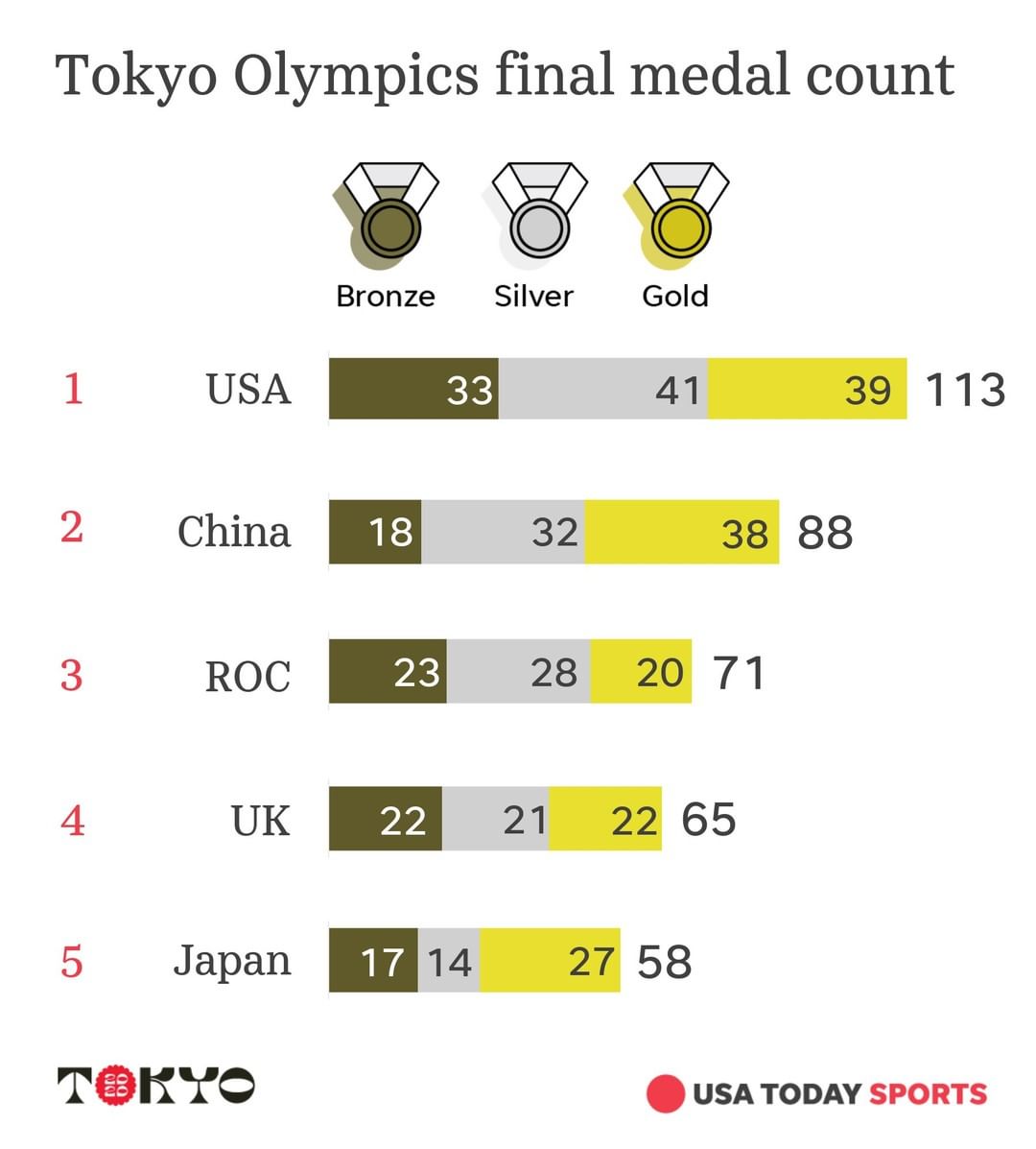 Team USA finished the Tokyo Olympics with 113 overall medals to China's 88, including 39 golds — the most of any country.