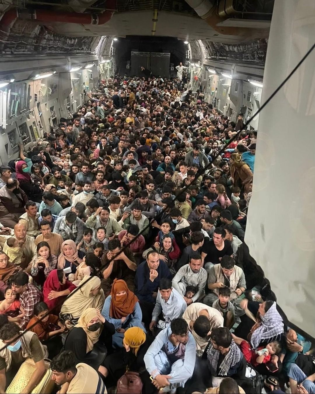 According to U.S. defense and security news site Defense One, the plane, a U.S. Air Force C-17, evacuated around 640 people on Sunday night, hours after the Taliban secured control of Kabul over the Afghanistan government. It was also reported the plane wasn't expected to have that many people, but more were able to board the plane through its half-open ramp before making its way to the Al Udeid Air Base in Qatar. This photo shows the inside of the plane.