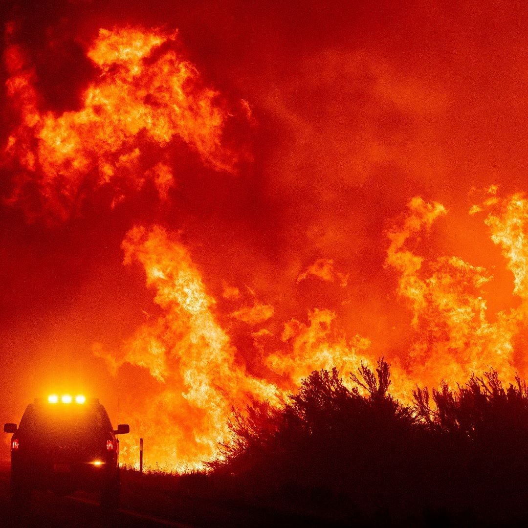 Flames leap above a fire vehicle as the Dixie Fire jumps Highway 395 south of Janesville, California, on Monday, Aug. 16, 2021.