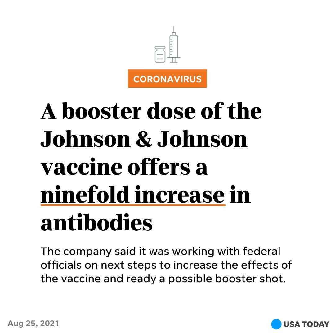 The Johnson & Johnson announcement said studies showed a booster dose of its vaccine showed "a rapid and robust increase in spike-binding antibodies, ninefold higher than 28 days after the primary single-dose vaccination." The company said it was working with federal officials, including the Food and Drug Administration and Centers for Disease Control and Prevention, on next steps to boost the effects of the vaccine and ready a possible booster shot.