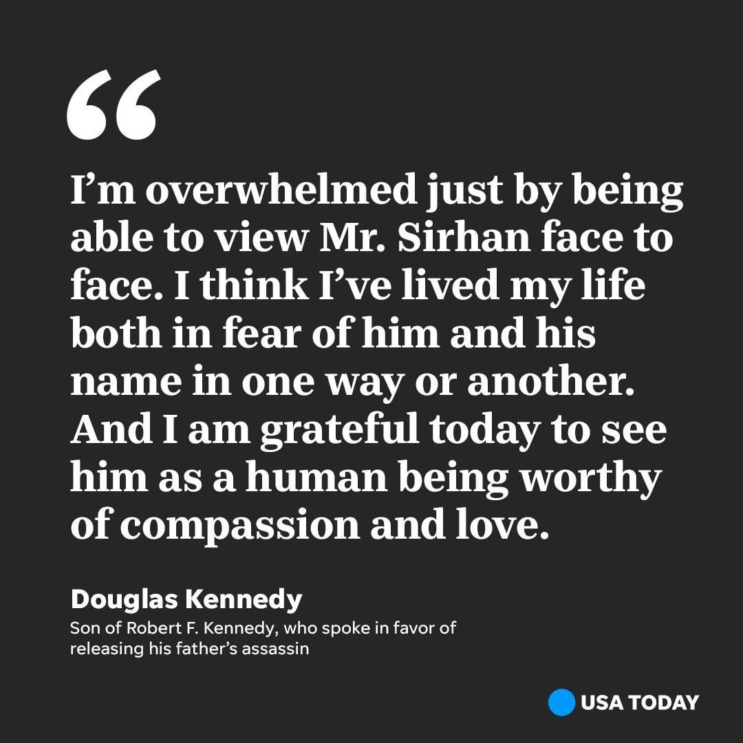 Douglas Kennedy, who was a toddler when his father was gunned down in 1968, said he was moved to tears by Sirhan’s remorse and he should be released if he’s not a threat to others.