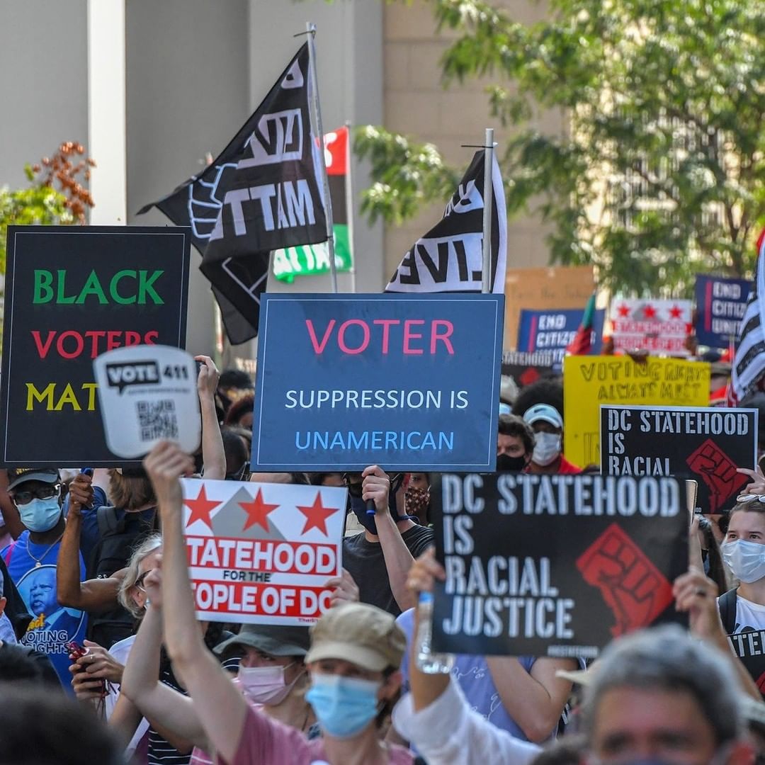 Many carried posters emblazoned with slogans such as "Our voice, our vote matter" and "Protect voting rights." Volunteers supplied water and masks. Others sold shirts and buttons.