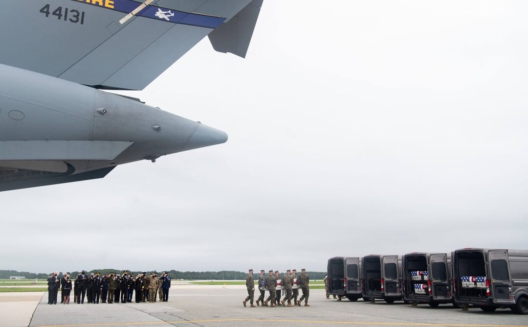 President Joe Biden and first lady Jill Biden attended the dignified transfer of remains Sunday at Dover Air Force Base for the American service members killed in a suicide bombing last week at the Kabul airport.